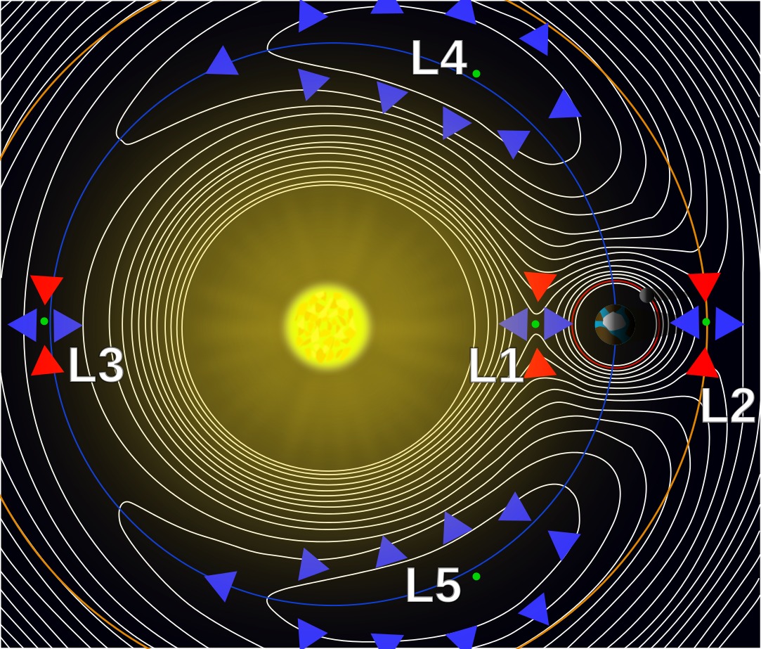 “That’s the beauty of Lagrange point 2.  The earth’s gravity and the moon’s gravity line up just right to create this little island of stability in space.  We appear to float over the moon’s surface.  In fact, we’re in orbit about the earth in such a way that the moon is always between us and the earth.”